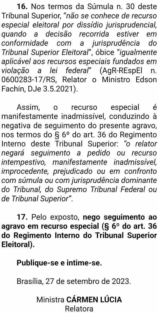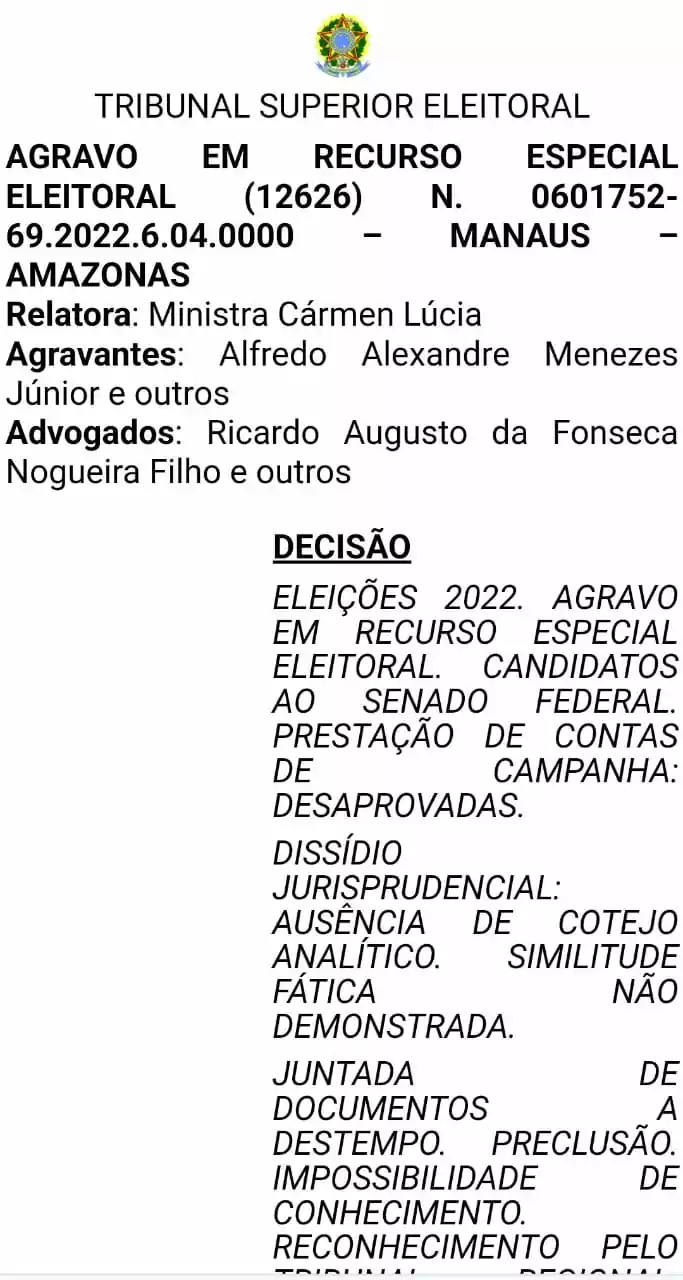 O pedido de Menezes foi rejeitado pela Ministra do TSE Cármen Lúcia, e o ex-candidato terá de devolver R$ 81,8 mil conforme determinou o TRE-AM ao ser condenado em junho de 2023.