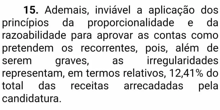 Ainda segundo o TRE-AM, o total das falhas detectadas na prestação de contas do ex-candidato corresponde a cerca de 12,41% do total das receitas arrecadadas na campanha eleitoral e, por isso, a regularidade das contas teria ficado comprometida.