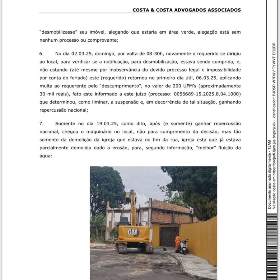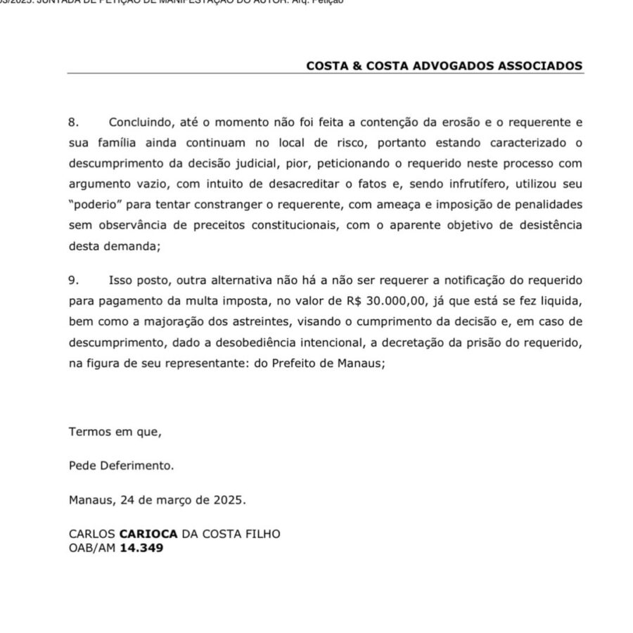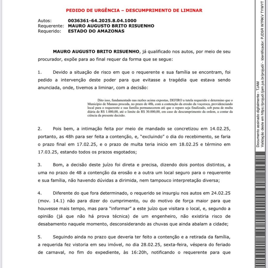 Outra determinação judicial que David Almeida está desobedecendo, seria do serviço emergencial de contenção da erosão em uma rua no Núcleo 23, do bairro Cidade Nova, zona Norte de Manaus.