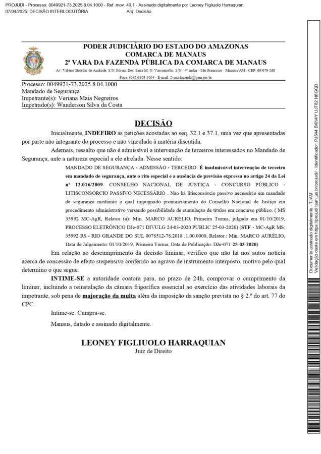 A decisão proferida pelo juiz Leoney Figlioulo da 2ª Vara da Fazenda Pública, deu um prazo de 24h para que o prefeito David Almeida devolva o equipamento da feirante, continua sendo descumprido pelo gestor municipal.