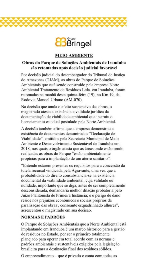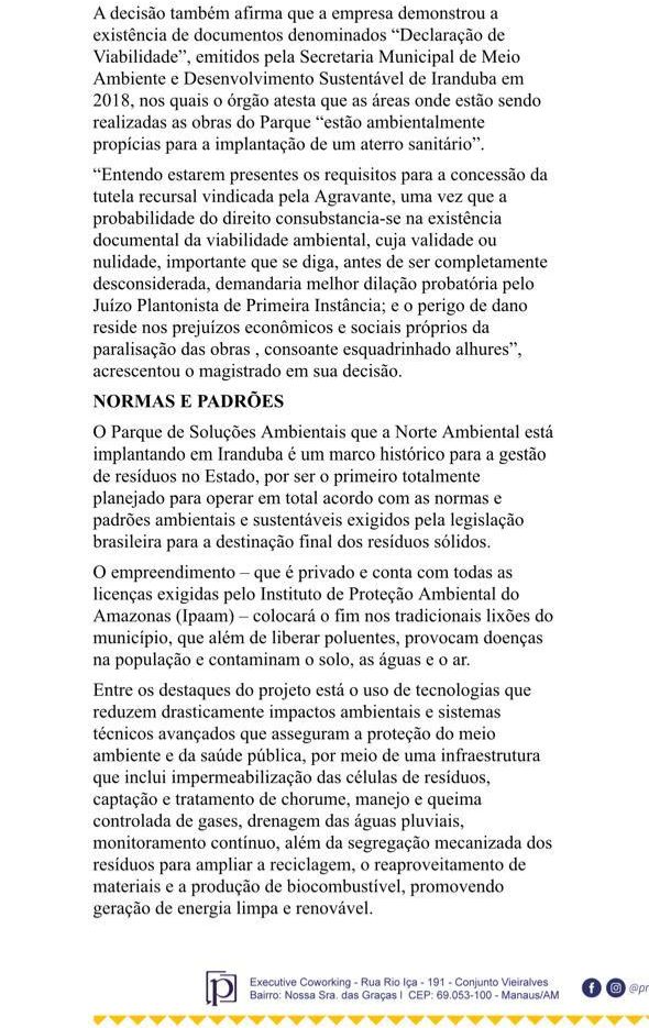 A decisão também afirma que a empresa demonstrou a existência de documentos denominados “Declaração de Viabilidade”, emitidos pela Secretaria Municipal de Meio Ambiente e Desenvolvimento Sustentável de Iranduba em 2018, nos quais o órgão atesta que as áreas onde estão sendo realizadas as obras do Parque “estão ambientalmente propícias para a implantação de um aterro sanitário”.