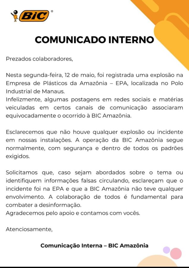 De acordo com a empresa, o local da explosão foi na Plásticos da Amazônia – EPA.