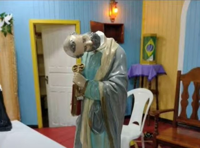 A imagem da santa Nossa Senhora de Aparecida teve a cabeça e as mãos decepadas e foi colocada no centro do altar, sem manto e sem redoma, provando o ato de intolerância religiosa.