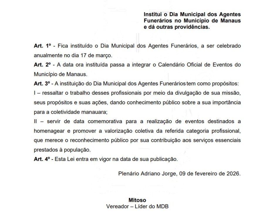 De acordo com a justificativa do PL apresentado por Mitoso a Câmara Municipal de Manaus (CMM), o dia 17 de março deverá ser celebrado o Dia Municipal do Agente Funerário.
