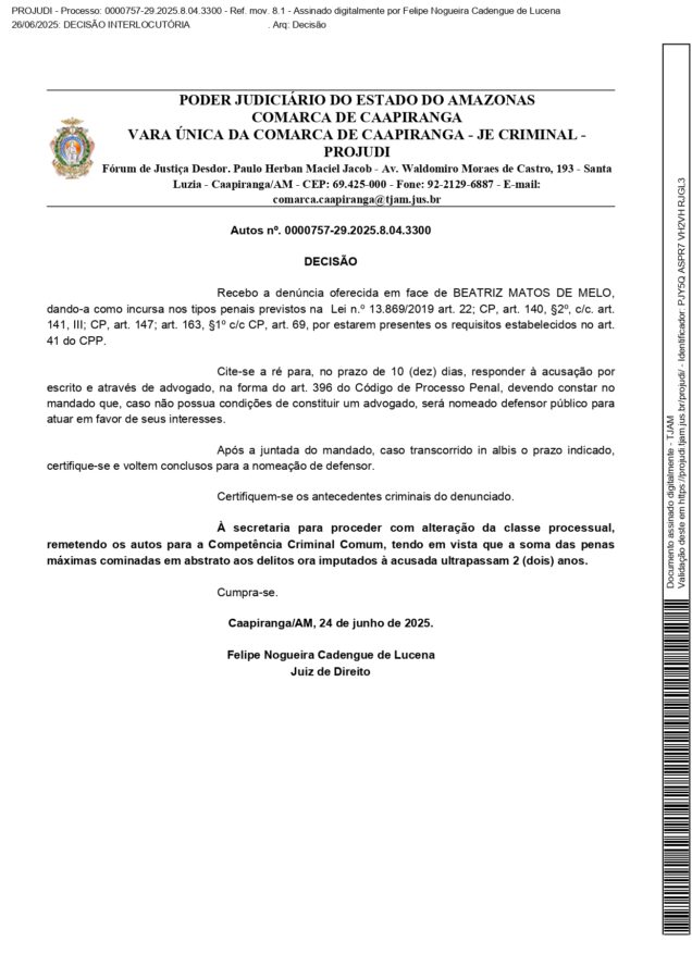 A vereadora de Beatriz Matos de Melo (Avante), é investigada pela Justiça do Amazonas pelos crimes de abuso de autoridade, ameaças e injúria, contra uma mulher no município de Caapiranga, interior do estado.