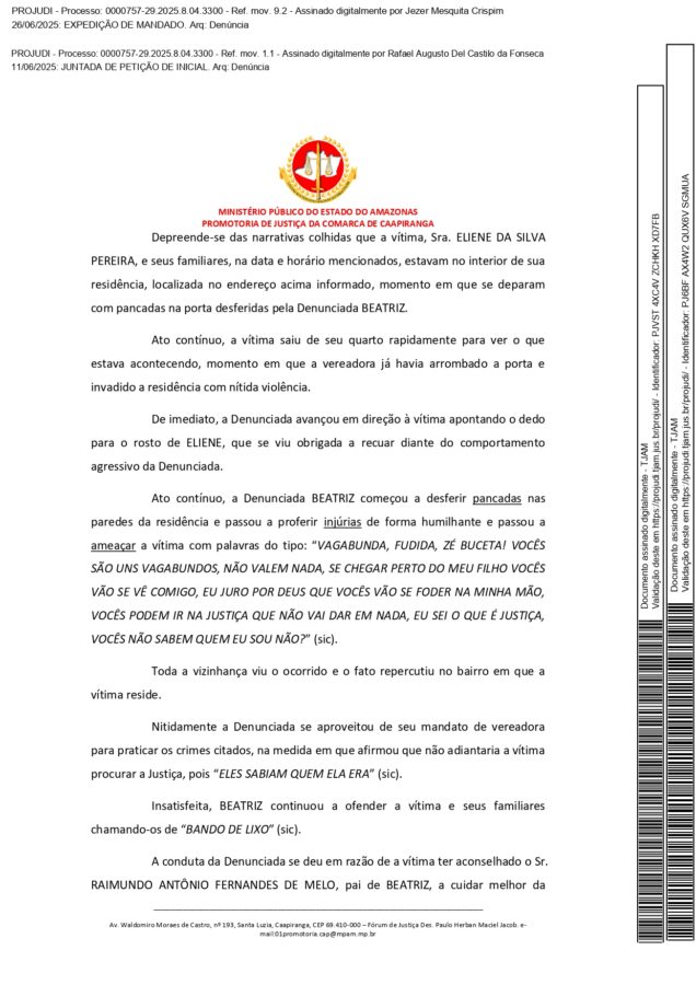 De acordo com a denúncia apresentada pelo Ministério Público do Amazonas (MP-AM), Beatriz Matos de Melo invadiu a residência da vítima de forma violenta e ameaçando a mulher, chegando a lhe agredir e lhe xingar com palavras de baixo calão.