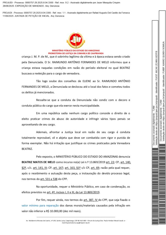 Ainda segundo o documento do MP-AM, “O Sr. RAIMUNDO ANTÔNIO FERNANDES DE MELO informou que a criança estava naquelas condições em razão do período eleitoral no qual BEATRIZ buscava a reeleição para o cargo de vereadora”.