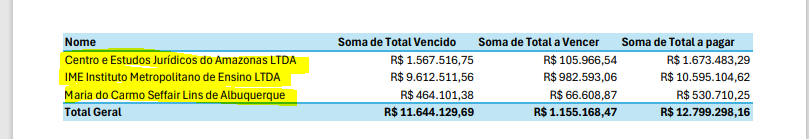 Ao todo, contando as empresas e sua própria dívida, Maria do Carmo deve o valor total de R$ 12.799.298,16 (doze milhões, setecentos e noventa e nove mil, duzentos e noventa e oito reais e dezesseis centavos).