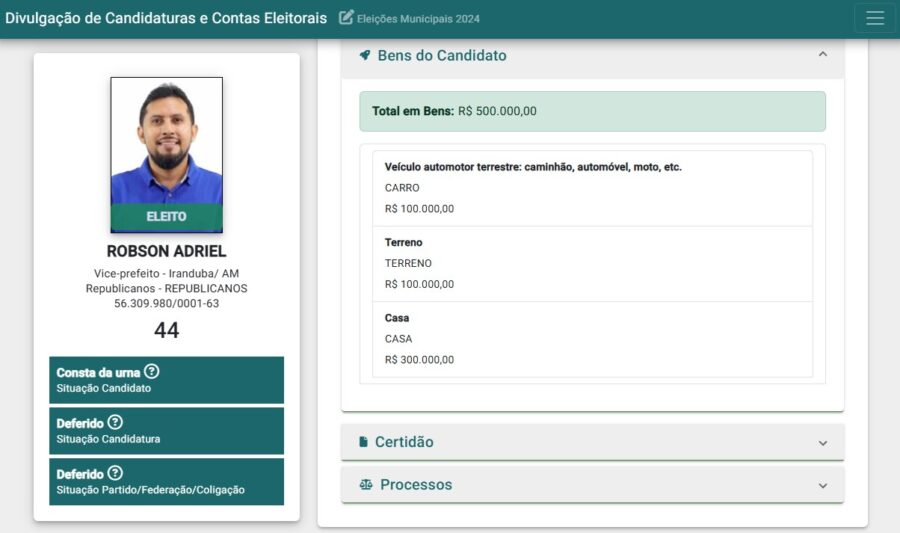 Já em 2024, quando concorreu novamente à vice-prefeito de Iranduba, Robson Adriel declarou ter um patrimônio de R$ 500 mil reais, com uma casa no valor de R$ 300 mil, um carro de R$ 100 mil e um terreno de R$ 100 mil.