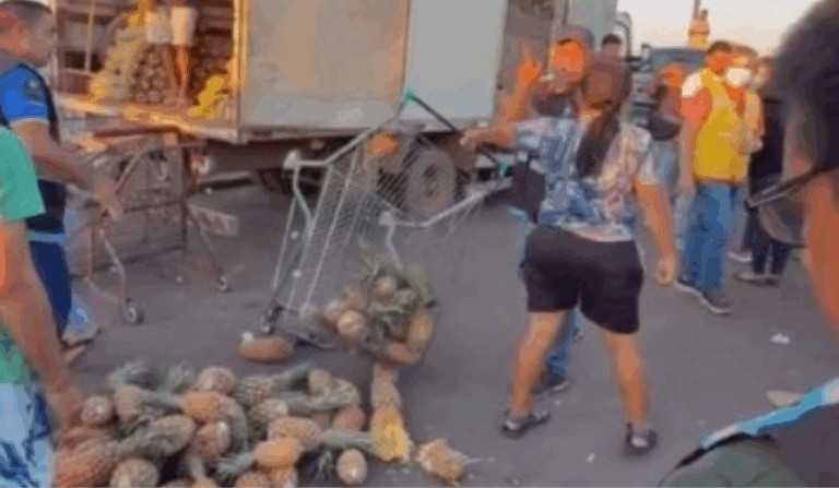 A mulher tenta impedir que eles levem seu carrinho com os produtos e imediatamente é atacada pelos agentes, que jogam sua frutas no chão.