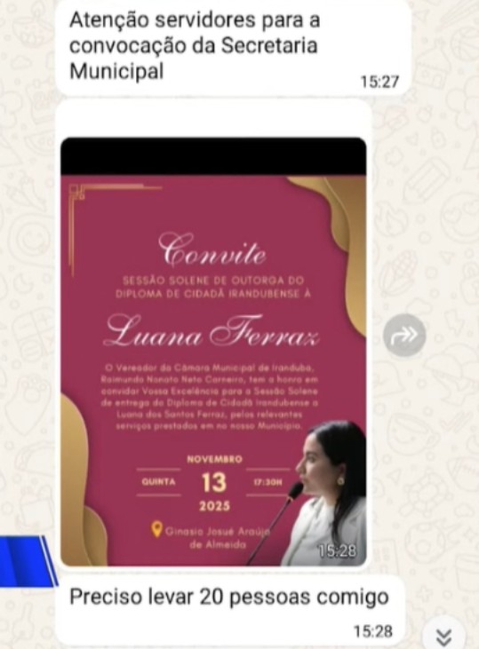 O servidor ainda precisa levar pelo menos mais vinte pessoas para a solenidade, já que Luana Ferraz precisa mostrar força política durante sua pré-campanha à deputada estadual.