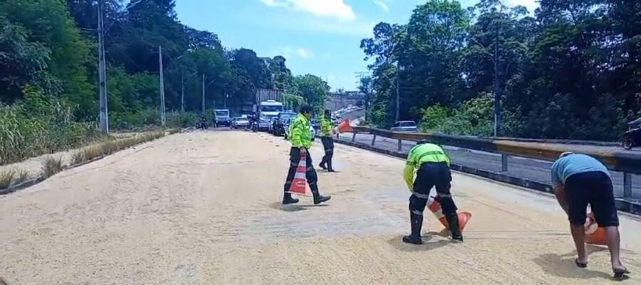 Uma carreta que transportava soja tombou na manhã desta segunda-feira (25/08) na Avenida das Torres, próximo à Avenida Timbiras, em Manaus. O acidente resultou na interdição de parte da via e deixou o trânsito lento na região.