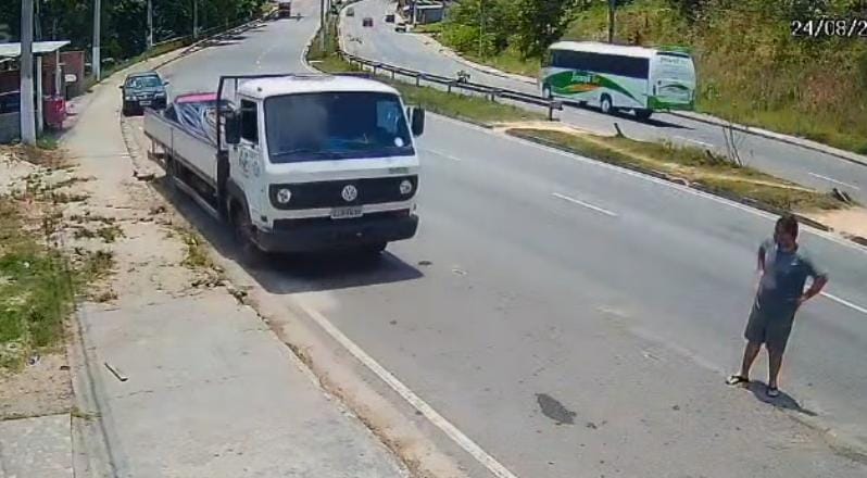 As imagens mostram um carro vermelho estacionado atrás da carreta. Logo após o motorista sair do veículo, a carreta começa a descer a ladeira e colide com o carro. Duas crianças que estavam dentro do automóvel foram resgatadas sem ferimentos.