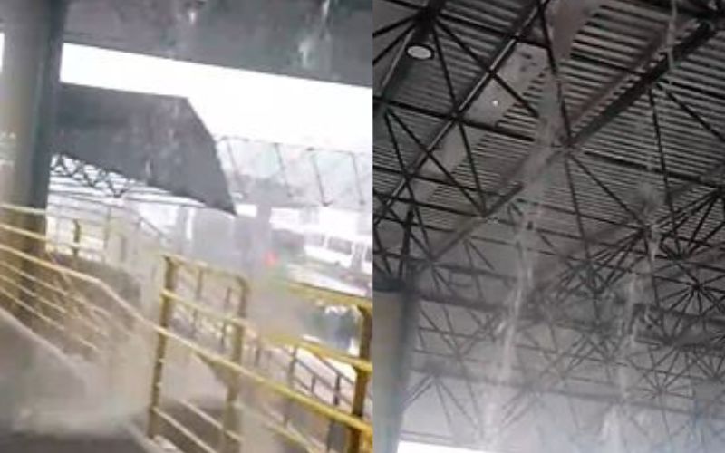 O telhado não aguentou a força da chuva e acabou se formando uma cachoeira, molhando as pessoas que esperavam o transporte coletivo.