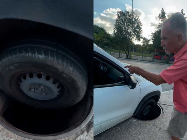 Nas imagens, um senhor pede ajuda a outros motoristas para retirar seu veículo que ficou preso no bueiro sem tampa no local. Um homem aproveitou para fazer um vídeo para cobrar a Prefeitura e o prefeito.