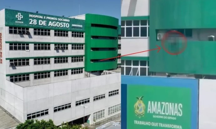Um vídeo que circula nas redes nesta quinta-feira (14/08), mostra um homem pendurado na saca do Hospital Pronto-socorro 28 de Agosto, no bairro de Adrianópolis, zona Centro-sul de Manaus.