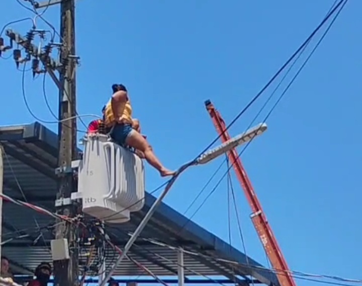 Moradores da área acionaram o Corpo de Bombeiros para auxiliar no resgate da mulher, que se equilibrava no transformador de energia com sinais de transtornos mentais.