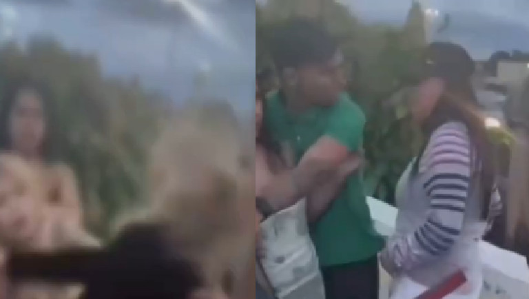 Durante a briga, as duas mulheres que estavam de vestido, deixaram as partes à mostra por conta de troca de tapas, socos e puxões de cabelo.