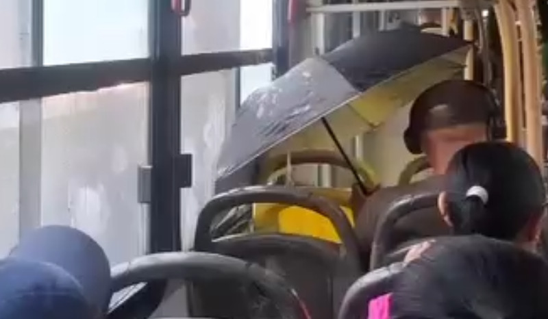 A situação foi registrada em vídeo que viralizou nas redes sociais, e mostra os passageiros abrindo o guarda-chuva já que o ônibus não tinha janela. Além da falta de janela, os passageiros mostrarem as goteiras que o coletivo apresenta.