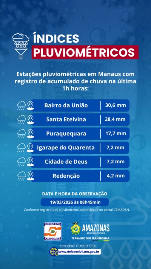 A Defesa Civil do Amazonas emitiu um alerta para a população, indicando risco de novos alagamentos ao longo do dia, além de possibilidade de deslizamentos em áreas urbanas da cidade.