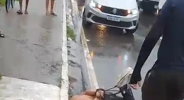 Trabalhadores da região da feira e pedestres resolveram fazer “justiça com as próprias mãos”, agrediram o suspeito e o amarraram do punho para os tornozelos, parecendo um suíno.