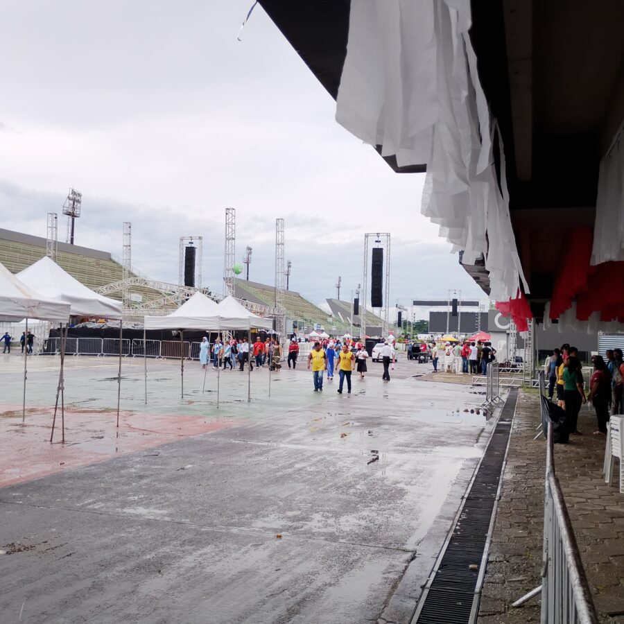 Uma equipe da Secretaria de Limpeza da Prefeitura e pessoas de várias paróquias de Manaus, tiveram de limpar o ambiente debaixo de chuva para deixar o local limpo para a realização do evento católico no Sambódromo.