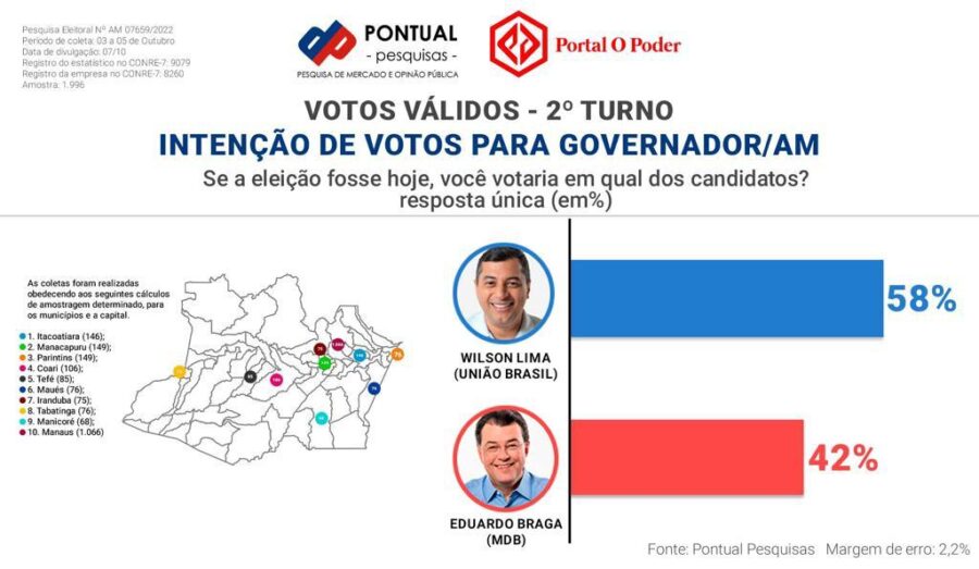 No primeiro turno das eleições, Wilson obteve 819.784 votos contra 401.817 de Braga. Com este resultado, Wilson Lima ficou com 417.967 votos de vantagem sobre Braga.De acordo com a Pontual Pesquisas, o segundo turno das eleições já demonstra uma larga liderança do atual governador.Na próxima semana, a Pontual Pesquisas divulgará um novo levantamento para o segundo turno das eleições.