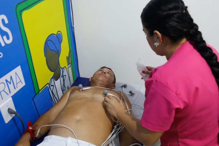 A sala de telediagnóstico conta com aparelho de eletrocardiograma, permitindo a avaliação da atividade elétrica do coração e o diagnóstico de condições como arritmias, infarto do miocárdio e outras alterações cardíacas. Os resultados são analisados por especialistas que atuam remotamente, garantindo mais agilidade e precisão no atendimento.