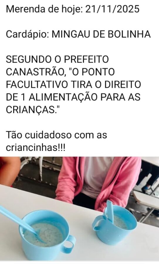 Para um gestor municipal que já gastou mais de R$ 408 milhões de reais em merenda escolar, dar para as crianças apenas bolacha creme cracker, suco de ki-suco e mingau de bolinha é um crime.